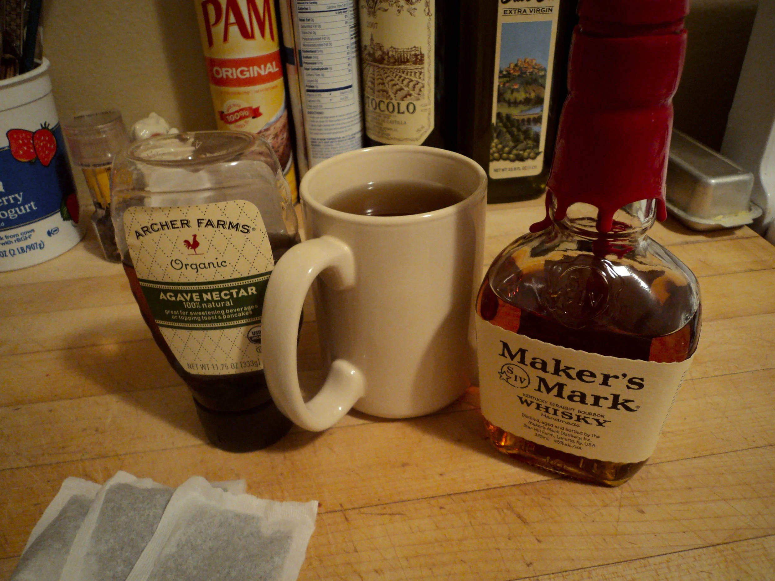 Heat up some water. Pour it in a cup over your tea bags. Pour in your whiskey. Add lemon juice and honey and to taste. Let the tea bags seep for about two minutes and then take those hot bags out. Pour that Hot Sonnie Boy into your thermos and bring it to work with you so you can drink it all day Carson McCullers style.