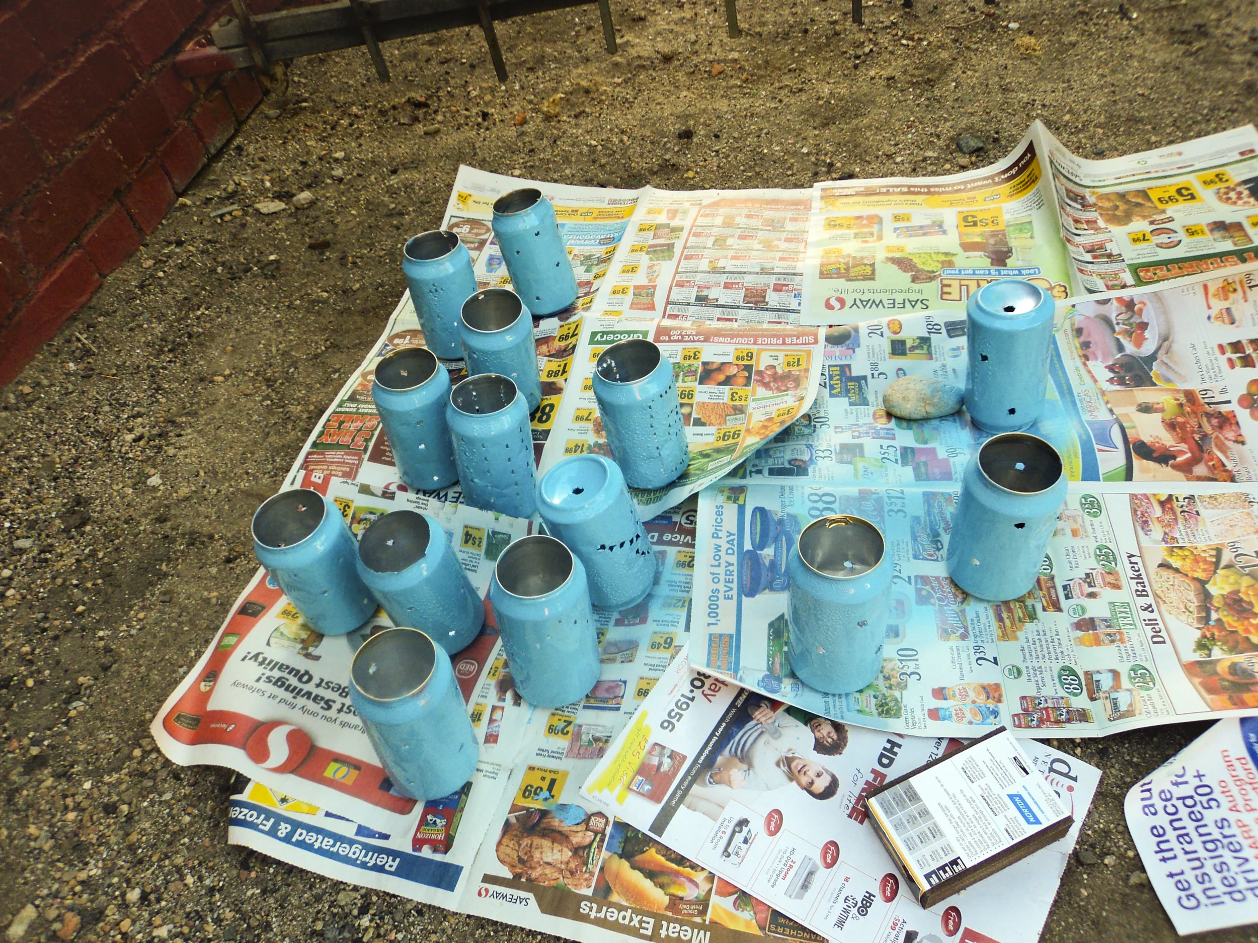 3.) Ok, now you get to jam holes into the bottom of the cans. We used a medium size-ish (turns out I don’t know drill terms) spade drill bit to do this.