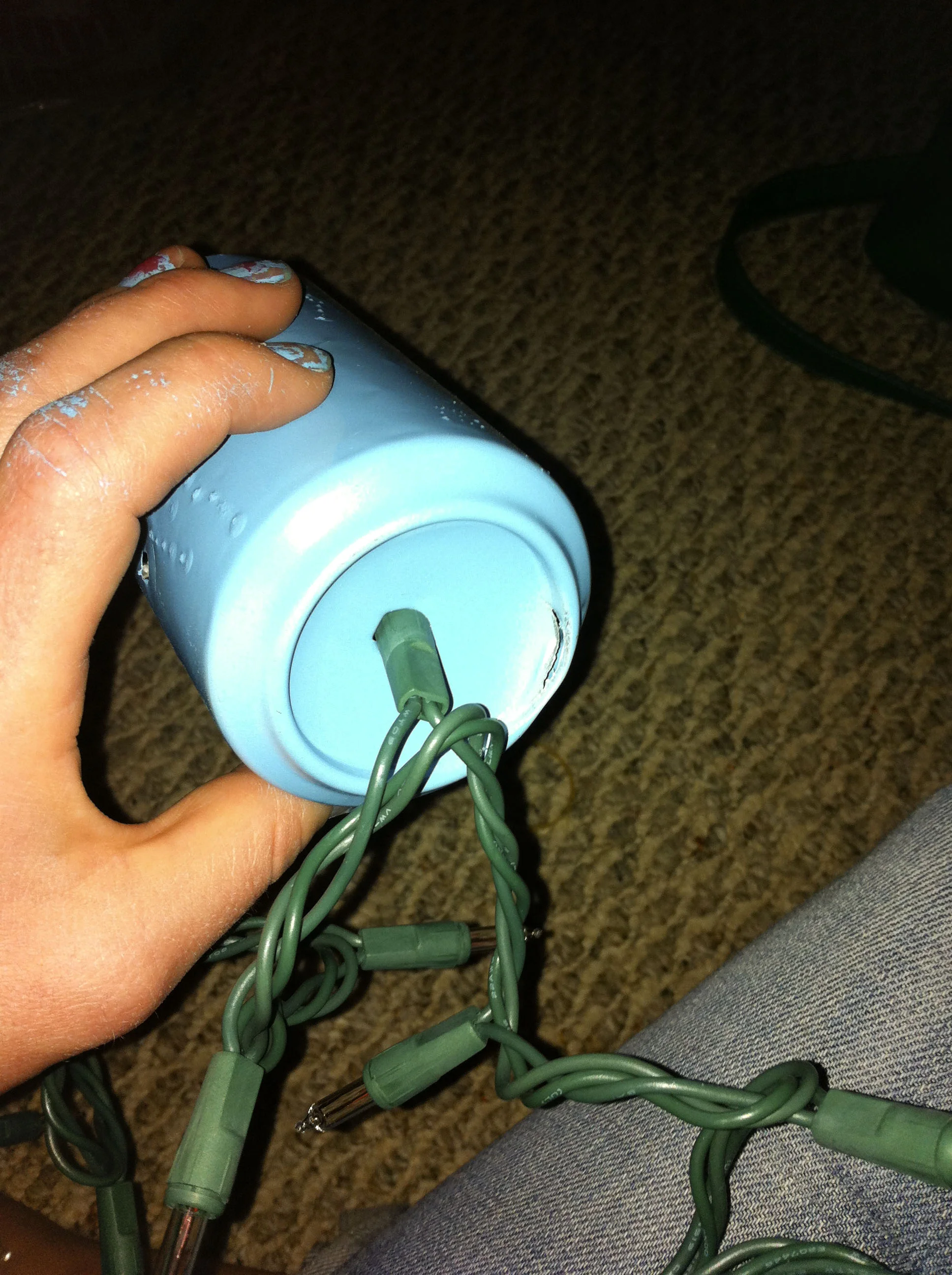 1.) Put your lights through the beer holes! You should be able to (somewhat forcefully) pop the lights into the holes on the bottom of the cans.