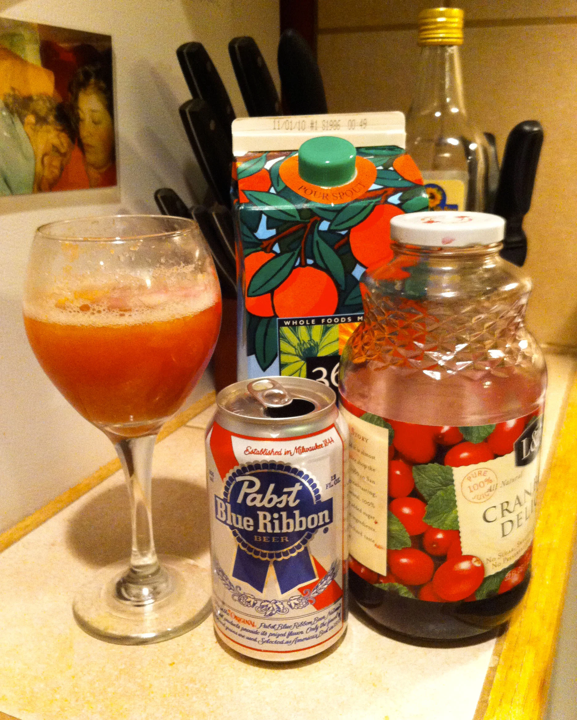 Pour your PBR into a pretty glass over ice. Fill the rest of the glass up with orange juice. Add a splash of cranberry juice for color AND taste! Oo lala!